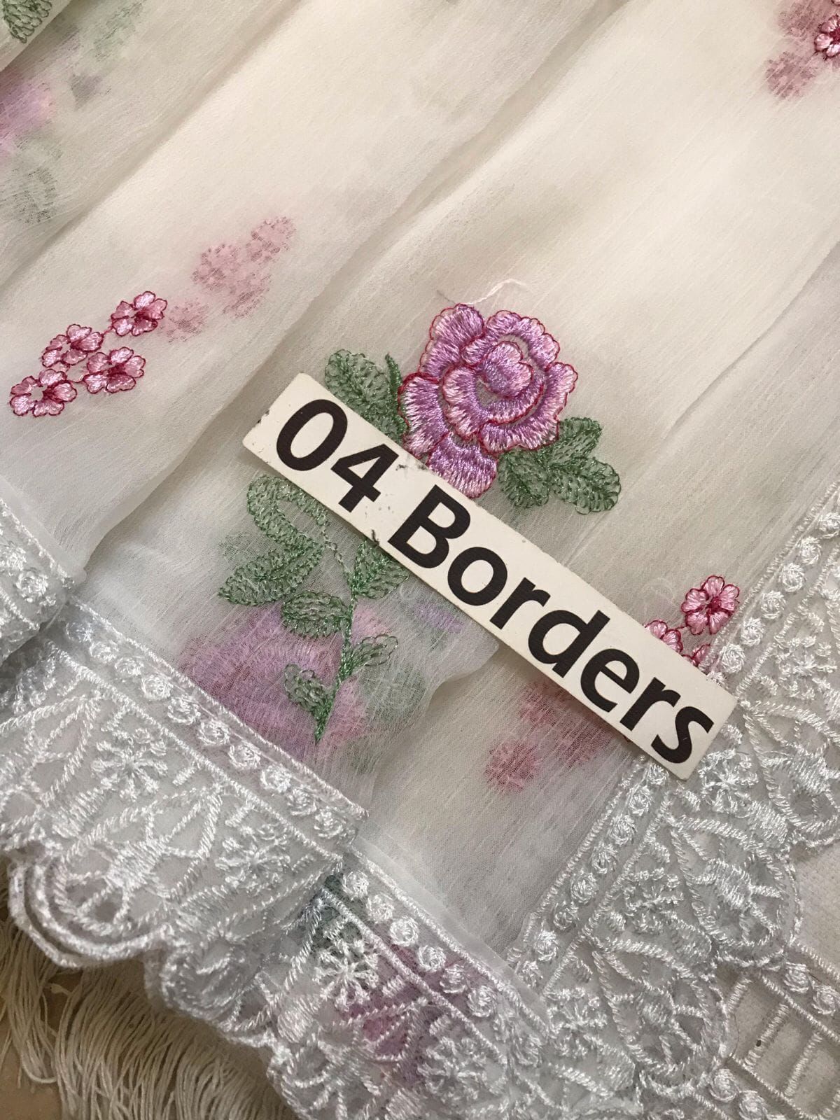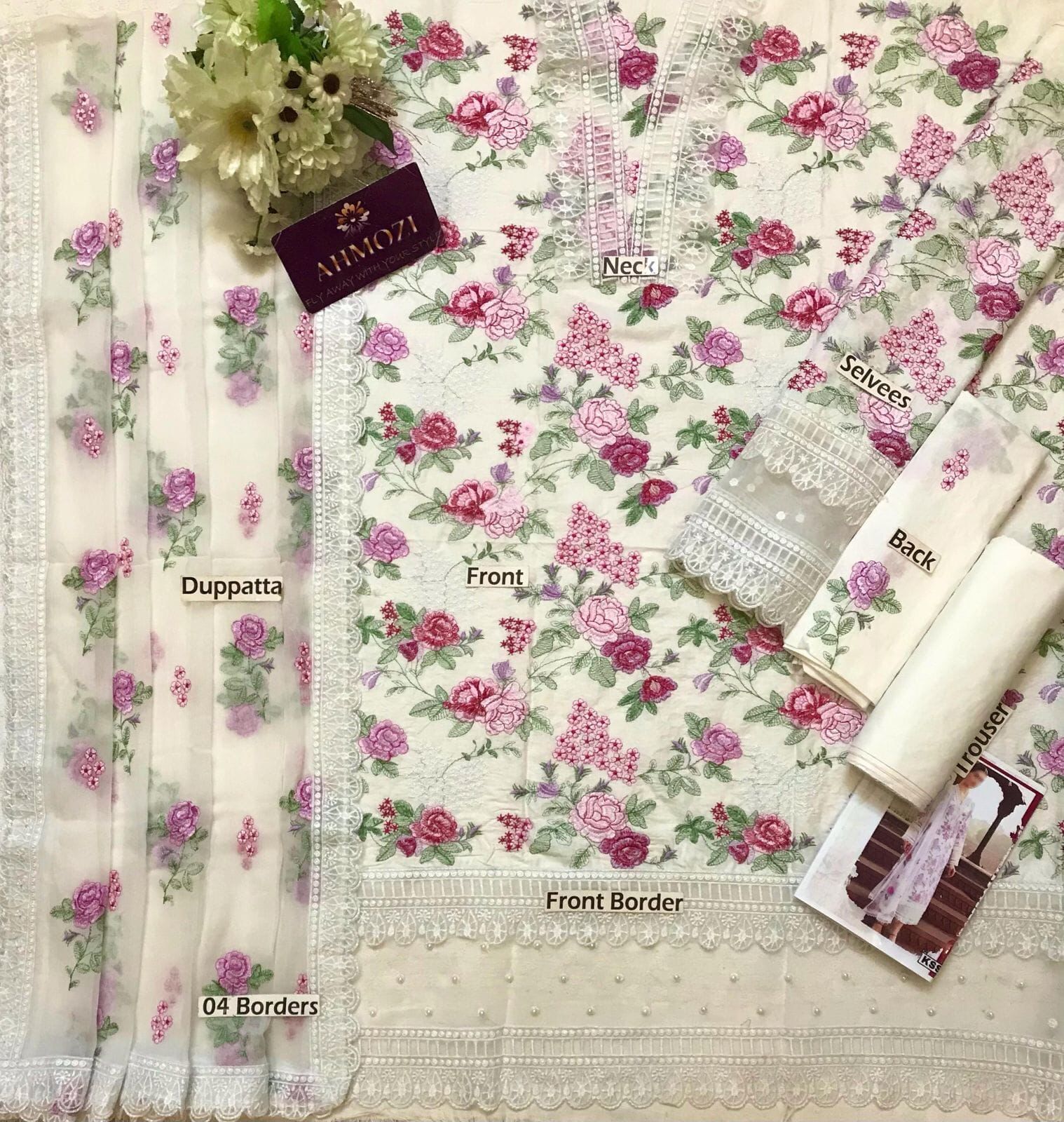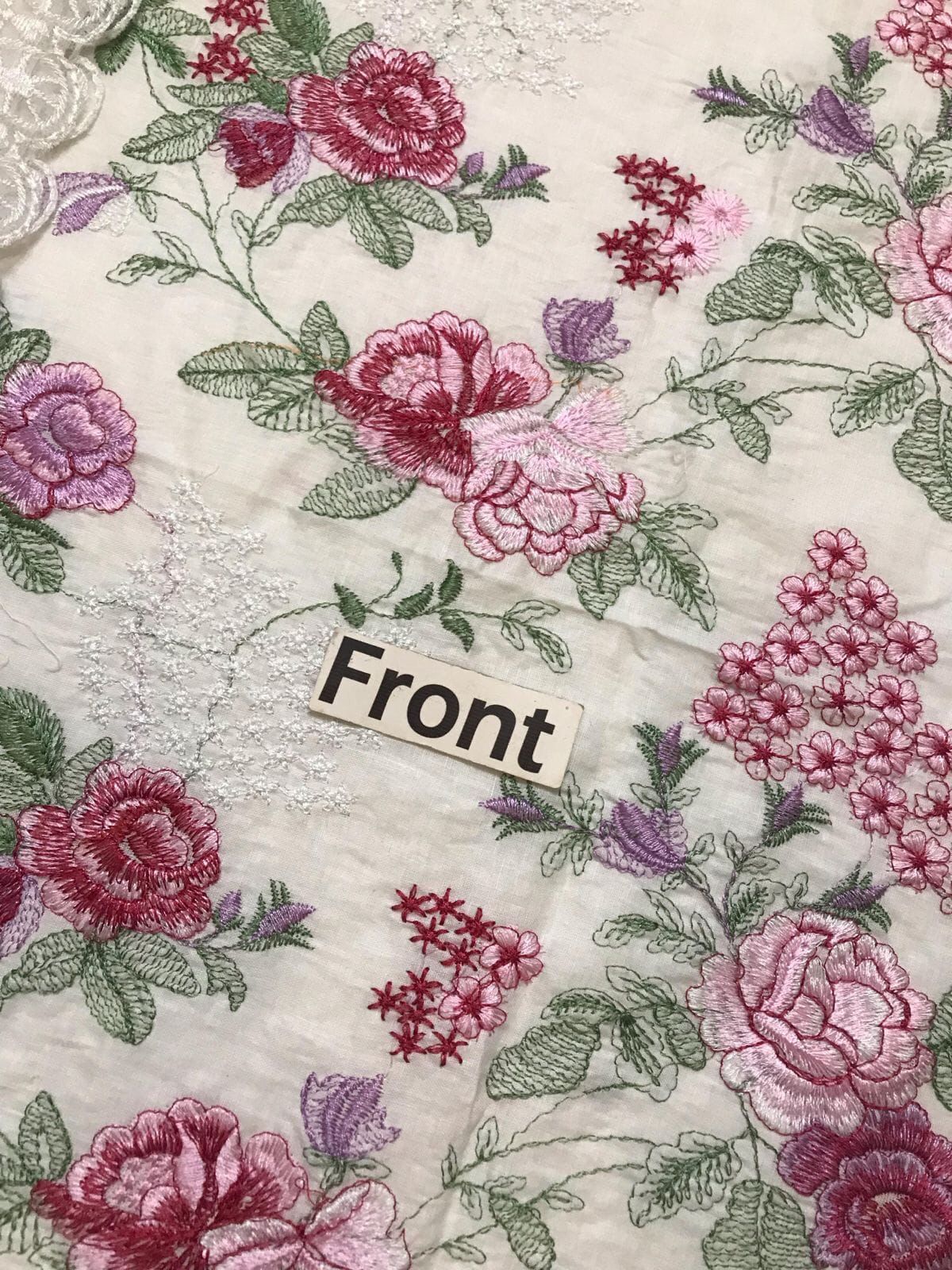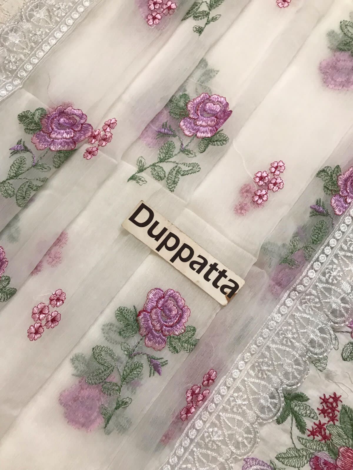 The CHIFFON DUPATTA is a masterpiece in itself, fully EMBROIDERED with delicate motifs that complement the shirt’s design. It is further enhanced by a luxurious 4-side embroidered border, adding weight and grace to its flow. This comprehensive embroidery work transforms the dupatta into a statement piece, capable of elevating the entire outfit and adding an extra layer of traditional charm and modern sophistication. The beautiful off-white base acts as a serene canvas, allowing the vibrant pink and purple floral embroidery, interspersed with lush green foliage, to truly pop and create a visually stunning contrast that is both elegant and captivating.