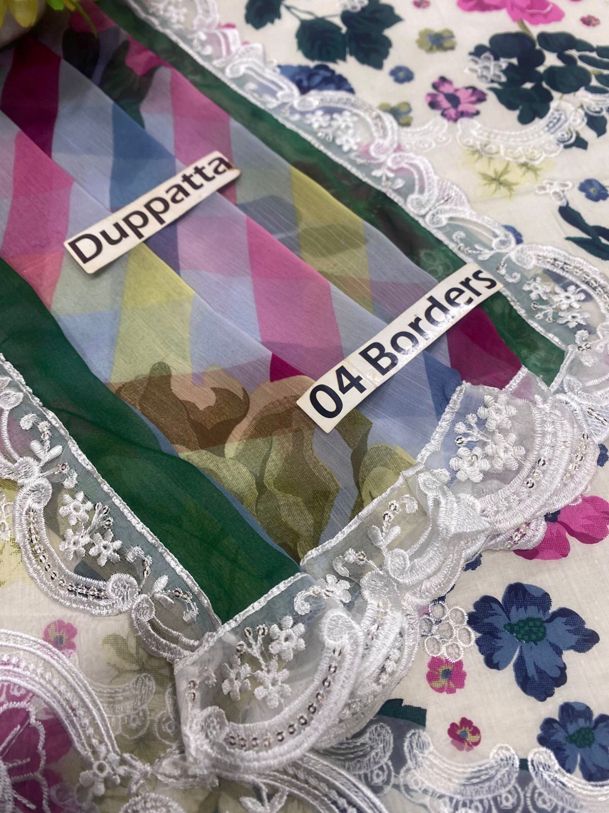 Perhaps the most captivating element of the **Bin Ilyas 2081-A design** is the accompanying **Printed Chiffon Dupatta**. Made from lightweight and flowing chiffon, the dupatta features a continuation of the mesmerizing floral print, creating a cohesive visual narrative. What truly sets it apart is the **4-side embroidered cutwork lace attached**. This intricate cutwork lace, with its delicate patterns, adds an ethereal elegance and a luxurious finish, making the dupatta a statement piece in itself. The airy nature of chiffon ensures graceful drapes and comfortable wear, perfect for complementing the structured lawn suit.