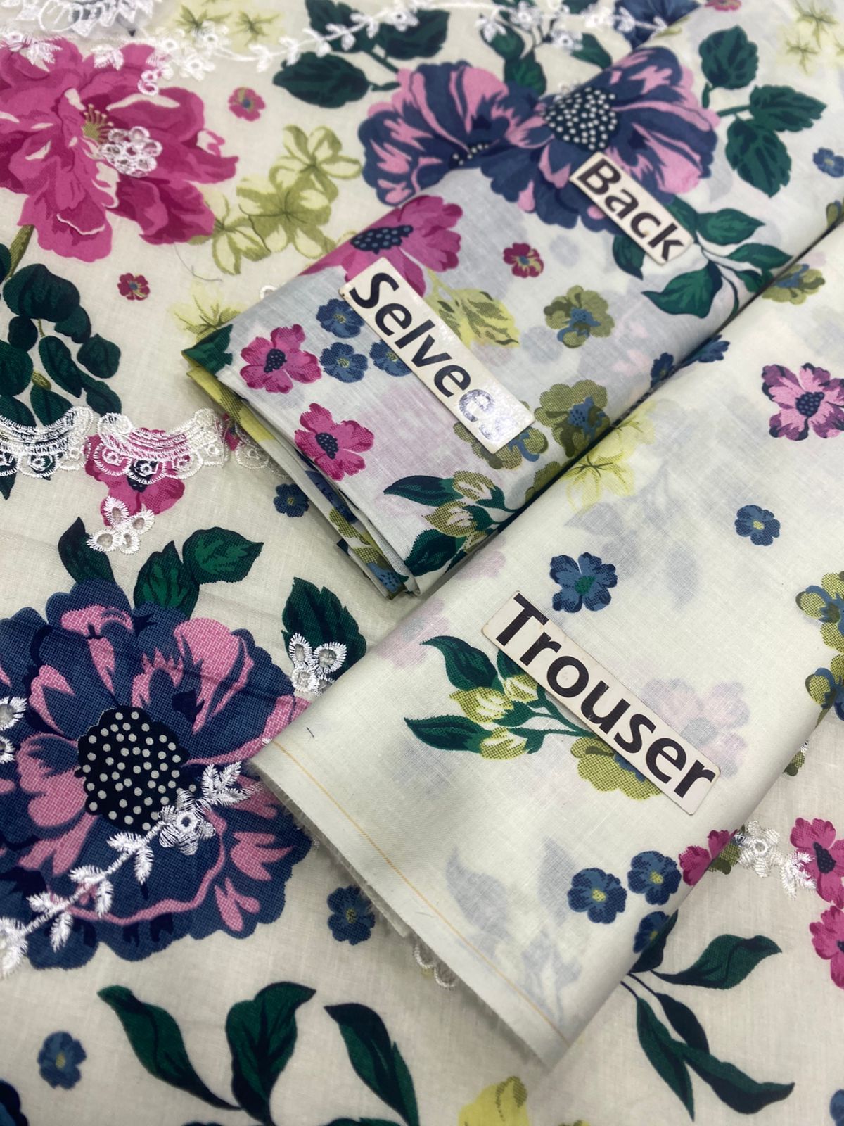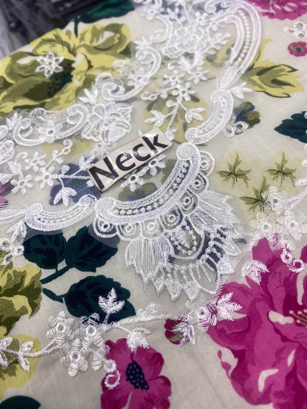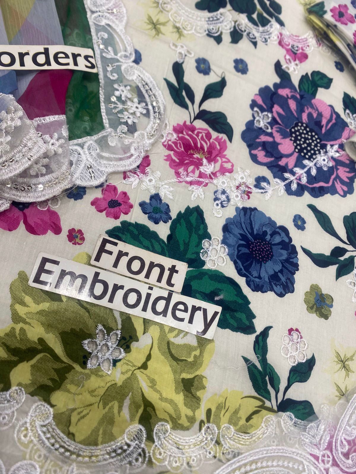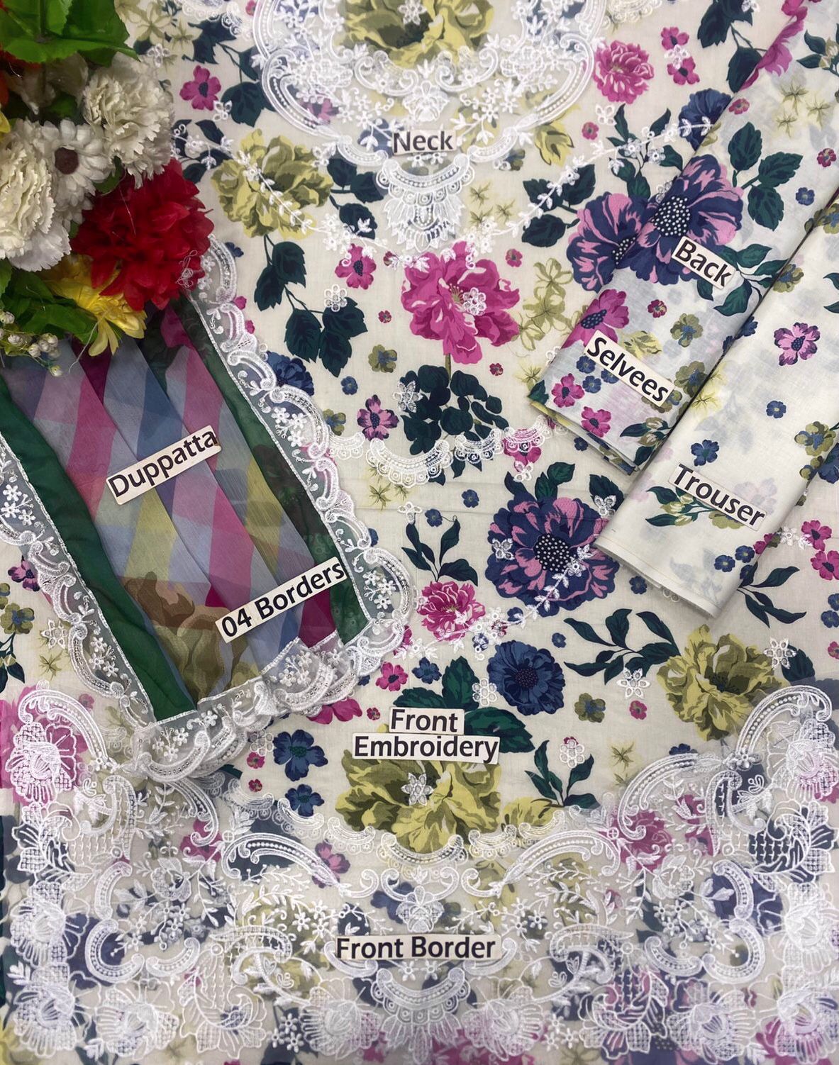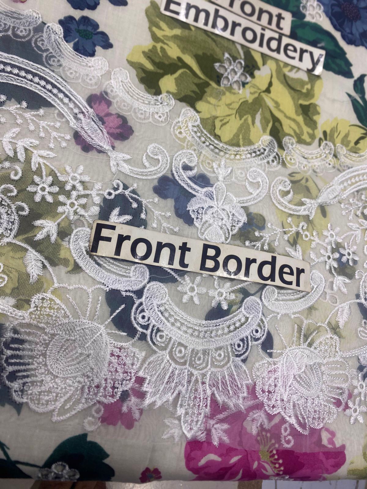 The shirt front is a masterpiece of design, featuring a **printed 90/70 Lawn Front with heavy embroidered chickenkari front**. The intricate chickenkari work adds a rich, textural dimension, elevating the suit from a simple printed design to a luxurious ethnic wear statement. Complementing this, a delicately designed **neck patch** is included, allowing for a bespoke finish that frames the neckline beautifully. The vibrant floral print scattered across the off-white base brings a lively touch, featuring an array of enchanting blooms in shades of fuchsia, deep indigo, serene blues, and soft olive greens, creating a harmonious and eye-catching palette.