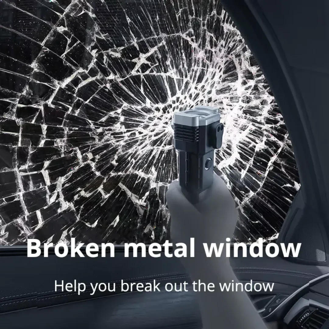 Rechargeable high-power LED torch with multifunctional design. Features a tactical hammer, power bank to charge phones, and comes in a protective box.