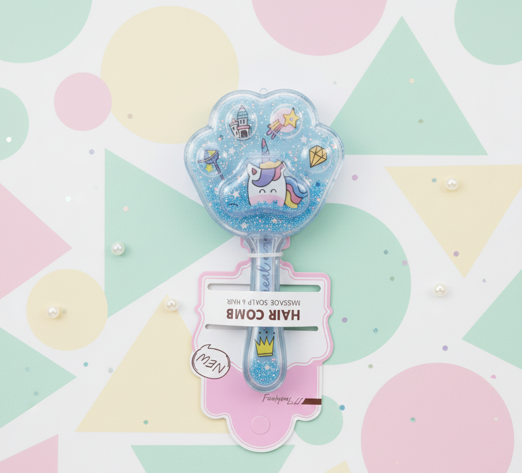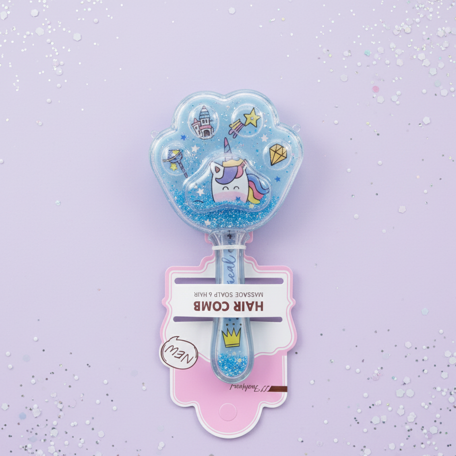 Bring a touch of magic to your daily grooming routine with this “Magical” Unicorn Hair Comb. Shaped like a cute animal paw, this brush features a transparent, liquid-filled back filled with swirling blue glitter, stars, and charming icons like castles and gems. At its center sits a colorful crowned unicorn, creating a captivating visual experience with every movement.Beyond its enchanting appearance, the brush is engineered for comfort and functionality. The ergonomic handle is easy for smaller hands to grip, while the flexible bristles are designed to glide through knots without tugging. Whether used on wet or dry hair, it serves as both a practical detangler and a relaxing scalp massager, turning hair care into a fun, sensory activity.Key ResponsibilitiesGentle Detangling: Smoothly navigates through various hair types to remove tangles with minimal breakage or discomfort.Scalp Stimulation: Provides a soft massage to the scalp and hair follicles, helping to distribute natural oils and promote relaxation.Sensory Engagement: Features a “shake-to-move” glitter back that provides visual entertainment and a calming sensory experience for users.Ergonomic Handling: Offers a lightweight, compact design that fits comfortably in the palm or a travel bag for on-the-go styling.Durability: Protects the internal liquid and glitter decorative elements with a thick, shatter-resistant transparent casing.