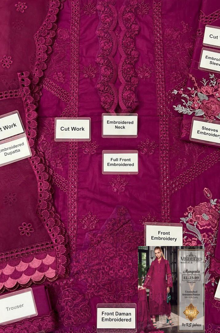 Dive into the opulent world of traditional fashion with the breathtaking **MARAI.B EL-23-09 Magenta Chikankari Embroidered Cotton Suit**. This unstitched luxury Pakistani dress, a masterpiece from the esteemed MARAI.B collection, is designed for those who appreciate intricate craftsmanship and vibrant aesthetics. The striking magenta hue, a symbol of royalty and vibrancy, makes this ensemble an absolute head-turner, perfect for any festive occasion, formal gathering, or celebratory event. Experience the fusion of rich heritage and contemporary style, meticulously crafted to elevate your wardrobe with this exquisite **designer Pakistani suit**.