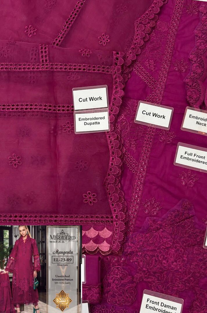 Crafted from premium quality cotton for the shirt and trouser, and exquisite organza for the dupatta, this **unstitched MARAI.B Chikankari suit** offers both comfort and undeniable style. The breathable cotton fabric makes it suitable for various climates, while the luxurious embroidery elevates it for special occasions. The versatility of an unstitched suit allows for custom tailoring to your exact measurements and preferred style, ensuring a perfect fit and personalized aesthetic. Whether you’re attending an Eid celebration, a traditional mehndi, a family gathering, or a grand reception, this **heavy embroidered magenta suit** will ensure you make a memorable impression. Embrace the rich cultural heritage and contemporary design philosophy of MARAI.B with this captivating **EL-23-09 collection outfit**. It’s not just a dress; it’s an investment in timeless elegance and exquisite craftsmanship. Available at an attractive this ensemble offers exceptional value for a high-end designer piece. Secure your **MARAI.B magenta Chikankari dress** today and step into a world of sophisticated grace. Perfect for **Pakistani fashion enthusiasts**, **Indian ethnic wear lovers**, and anyone looking for a **festive embroidered suit** with a luxurious feel.