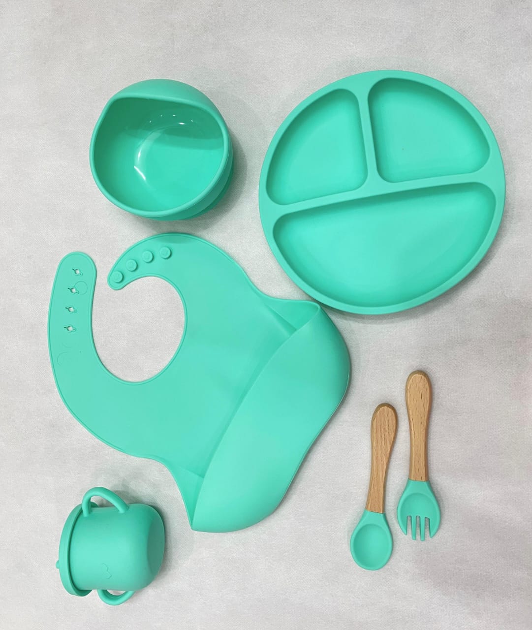 Transitioning to solid foods is a major milestone, and our Premium Silicone Baby Feeding Set is designed to support your little one every step of the way. Crafted from 100% food-grade, BPA-free silicone, this set is gentle on developing gums while being tough enough to withstand daily use.The set includes a divided suction plate to keep food groups separate and a deep suction bowl with a curved lip to help toddlers scoop food easily. The adjustable silicone bib features a wide “crumb catcher” pocket to keep outfits clean. To support hydration, the double-handle straw cup provides a secure grip for small hands. Completing the set are a soft-tip spoon and fork with natural wood handles, specifically shaped to promote the development of fine motor skills during self-feeding.Key Features & BenefitsSafety First: Made from 100% non-toxic, food-grade silicone; free from BPA, PVC, Phthalates, and Lead.Strong Suction Technology: Both the plate and bowl feature reinforced suction bases to prevent slips, flips, and “flying plates.”Heat Resistant: Safe for use in the microwave and freezer; perfect for warming up meals or storing leftovers.Easy Maintenance: The silicone components are top-rack dishwasher safe, stain-resistant, and won’t harbor bacteria.Ergonomic Utensils: Smooth wooden handles paired with soft silicone tips protect sensitive mouths while encouraging independent gripping.Imported From ChinaItems Include×1 Bib×1 Bowl×1 Cup×1 Spoon×1 Fork×1 Plate