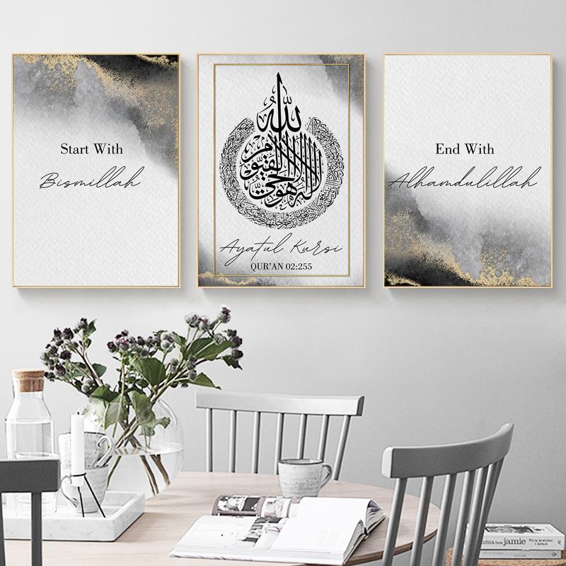 Elevate your interior with this thoughtfully curated set of 3 Islamic motivational wall art frames. Each 8×11″ phototile is crafted from high-quality MDF wood, offering a smooth finish and lasting durability. The set features spiritually uplifting designs:“Start With Bismillah”“Ayatul Kursi – Qur’an 2:255”“End With Alhamdulillah”These minimalist yet powerful prints combine abstract black, white, and gold backgrounds with meaningful Islamic calligraphy, creating a serene and inspiring atmosphere. The frames come with pre-attached sticky tape for effortless wall mounting—no nails or tools required.Perfect for dining areas, prayer corners, or gifting during Ramadan, Eid, or housewarmings, this set blends spiritual depth with modern design.