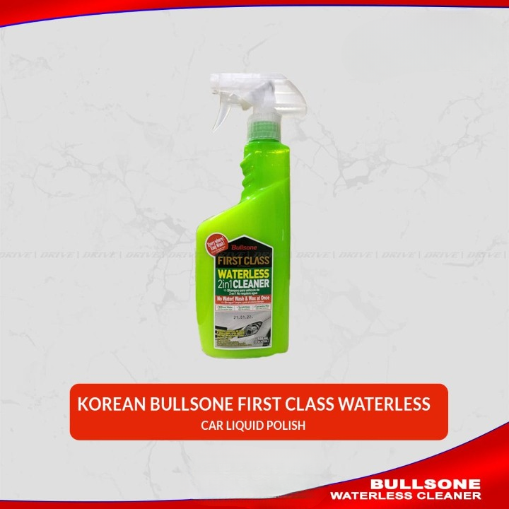 This image shows a bottle of Bullsone First Class Waterless 2-in-1 Cleaner. This is a car care product designed to clean and wax your vehicle without using a single drop of water.Here are the key details about this product:Product OverviewBrand: Bullsone (a well-known Korean car care brand).Type: Waterless Wash & Wax.Quantity: 550 ml (18.60 fl. oz.).Key Ingredients: Contains Carnauba Wax for a high-gloss finish and protection.Main Features2-in-1 Action: It cleans the dirt off the car and applies a layer of wax at the same time.No Water Needed: Perfect for people living in apartments or areas where washing with a hose is difficult.Scratch-less Formula: Designed to lift dirt away from the surface to prevent scratching the paint during the wipe-down.Easy to Use: You simply spray it on a dirty panel and wipe it off with a clean microfiber towel.How to UseSpray: Apply the cleaner directly onto the car’s surface (work in small sections).Wipe: Use a clean, soft microfiber cloth to gently wipe away the dirt.Buff: Use a second dry microfiber cloth to buff the area for a shiny, waxed finish.Note: This product is best for cars with light to moderate dust. If your car is covered in heavy mud or thick grit, it is still safer to rinse it with water first to avoid scratching.